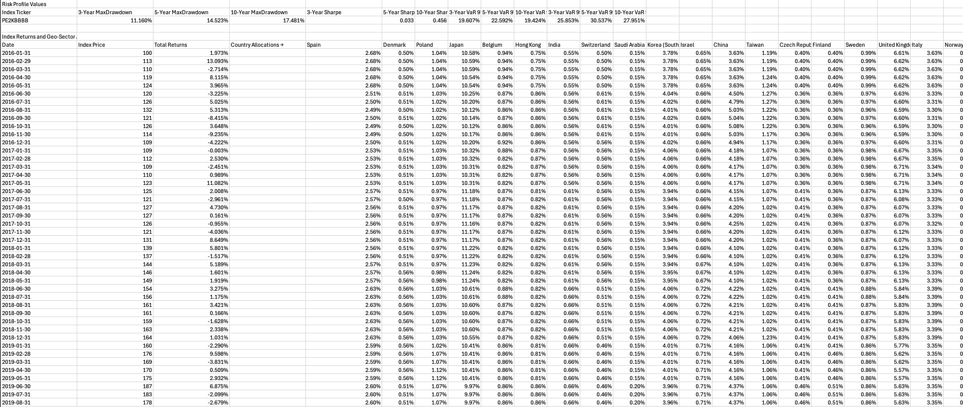 For better clarity, an empty row is added between the Risk Profile Values table and the Index Returns and Geo-Sector Allocations Table, and an empty column is inserted before each allocation group whose header denotes what sector-region allocations the next set of columns denote.