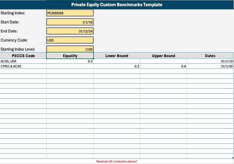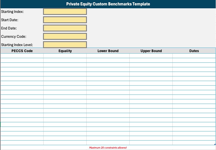 If the user clicks the Custom Benchmarks option again, the above sheets will be created again with numbers appended to them in order (1), (2), and so on. If the sheet “CB PECCS® - YYYY-MM-DD” already exists, it won’t be created again.In the newly created sheet, a table template is provided where users can input these values