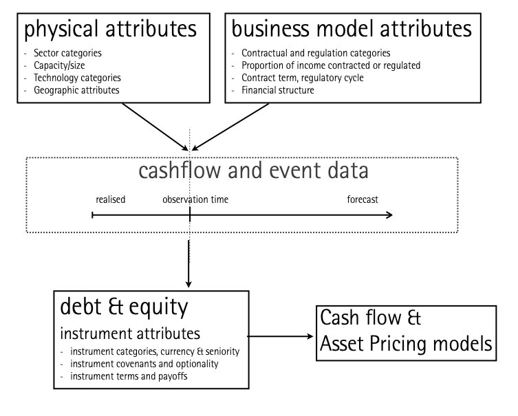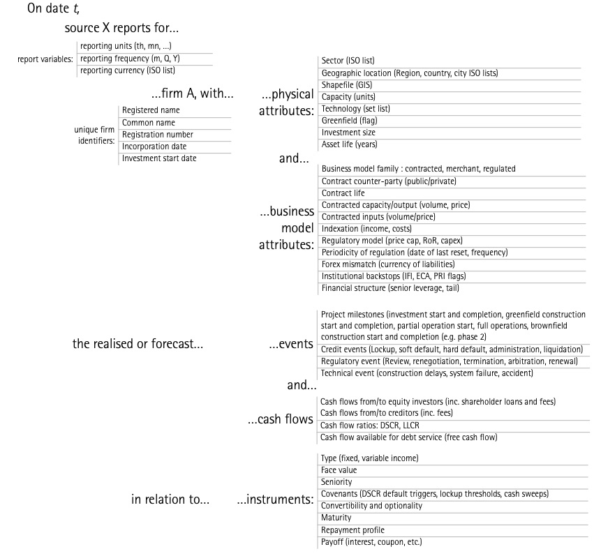 Capturing realised and forecast changes in time of the attributes of either firms or instruments is of particular importance in the case of infrastructure investments because of the path-dependency and sequential resolution of uncertainty, which characterises these types of investments. For example project debt may change its maturity date post-restructuring, which is instrumental in the context of asset pricing and computing duration. Importantly, because of the long-term nature and large sunk costs implied by such investments, long-range cash flow projections and detailed financial models are well documented and frequently revised. All such data points are therefore observable.