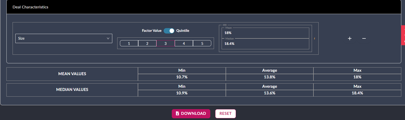 The “Deal Characteristics” selection then allows you to go a step further in customising your comparables set for a chosen metric. Here you can specify specific asset characteristics as a factor value or select a quintile. The Deal Characteristics takes into account all previous selections made in the Deal Profile to produce overall mean and medians as well as the ranges for your chosen metric based on a more granular sample.