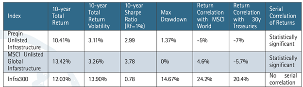 It is well known that contributed indices that use appraisal values for private assets tend to exhibit 'smooth’ returns that do not reflect the market price of risk or its variance over time. This is the case if we look at two such indices for unlisted infrastructure equity (see table).
