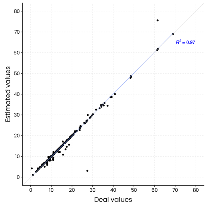 Looking at EV/EBITDA in particular, you can see how close our estimations are to reported deal values, with an R2 value of 0.97.