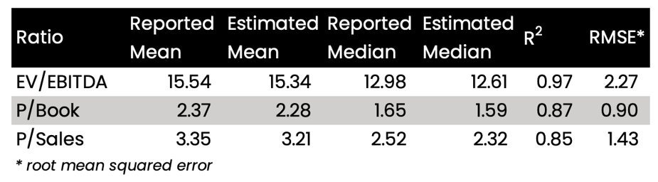As a proof of concept, we recently tested our model on over 250+ deals. The below table shows a comparison between mean and median valuation ratios estimated by our model, and the reported mean and median valuation ratios.