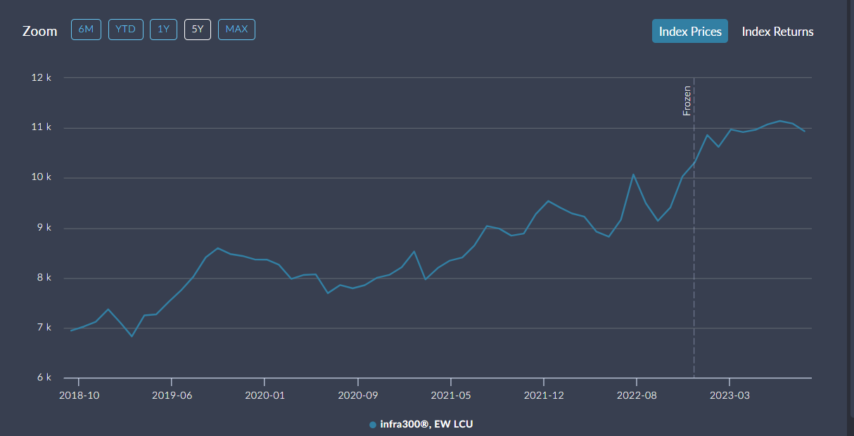 A dotted line title Frozen within the Market Indices product demarcates the point up to where index results are frozen.
